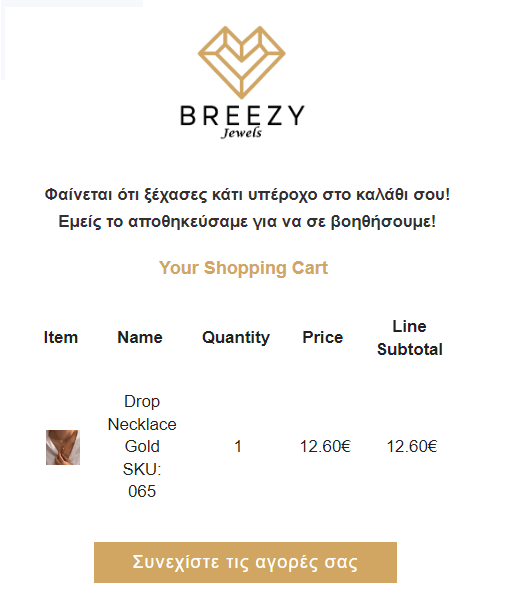 - Τους στέλνει αυτόματα emails μετά από χ ώρες υπενθυμίζοντας τους ότι άφησαν το καλάθι τους. Μέσα στο email περιέχονται ακριβώς τα προϊόντα που άφησαν στο καλάθι τους, καθώς και button που τους πηγαίνει απευθείας στο checkout της παραγγελίας τους!