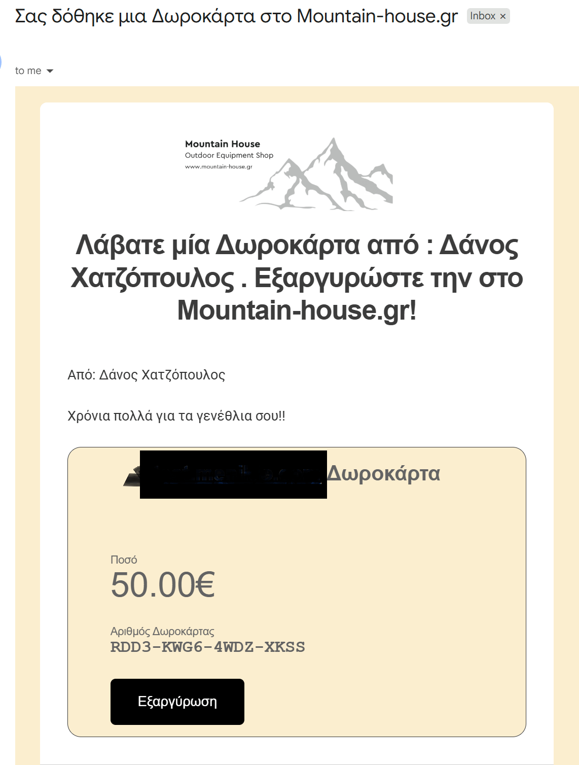 Με το που κάνετε το παραπανω που αναφερω, δηλαδη το να βαλετε την παραγγελία της δωροκάρτας σε “Στάλθηκε”, ο παραλήπτης της δωροκάρτας δέχεται αυτό το email: