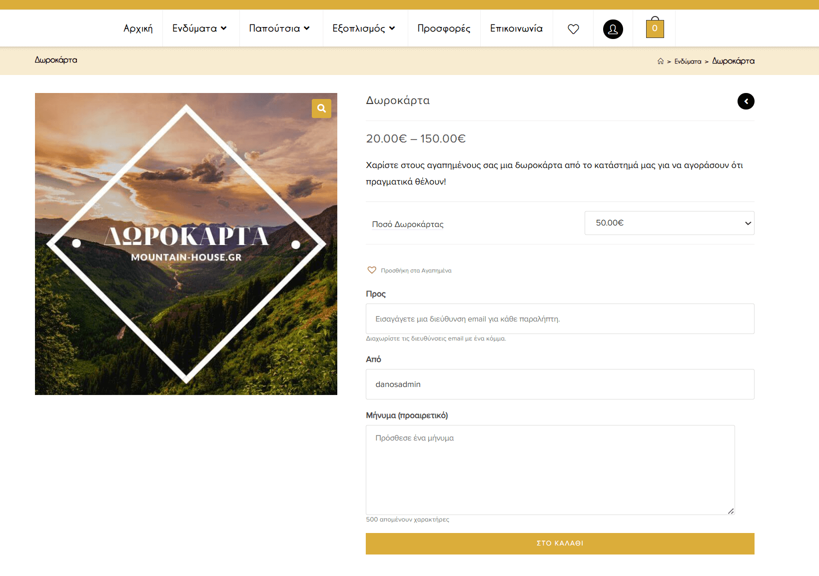 Ο πελάτης σας πληκτρολογεί σε ποιον επιθυμεί να στείλει την δωροκαρτα αυτη (το εμαιλ του) καθως και το μήνυμα που θελει να του γραψει προαιρετικά.