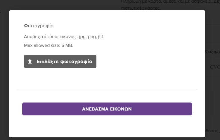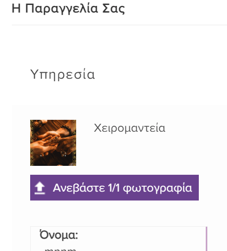Στο checkout, σε προϊόντα της επιλογής σας ο πελάτης ΠΡΕΠΕΙ να ανεβάσεις φωτογραφία/ες ώστε να μπορέσει να προχωρήσει σε ολοκλήρωση της παραγγελίας του.